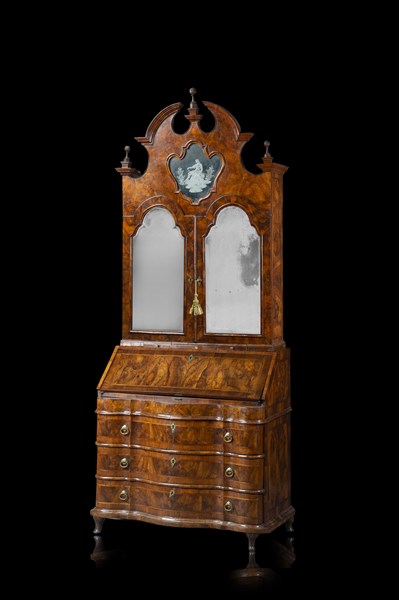 Trumeau lastronato in noce e radica, parte superiore con cimasa decorata da pinnacoli torniti, centrata da specchio inciso con figura allegorica, ante a specchio celanti vani e cassettini, parte inferiore a tre cassetti mossi sul fronte, anta ribaltabile con scarabattolo interno. Lombardo-Veneto, secolo XVIII (cm 106x255x60) (lievi difetti)