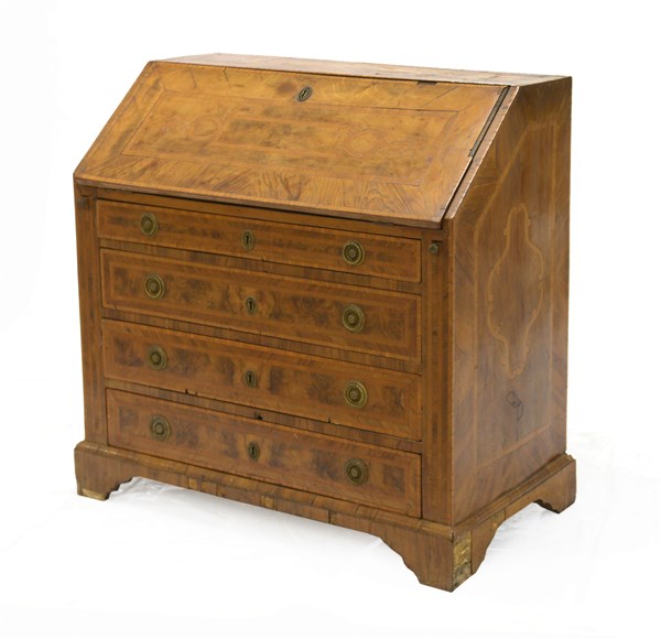 Ribalta lastronata e intarsiata in legni vari, fronte a tre cassetti e mezzo e anta ribaltabile. Secolo XVIII (Cm 100x99x51) (mancanze)