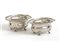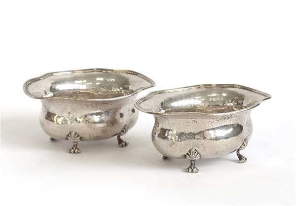 Coppia di alzate in argento martellato di forma mossa con piedi a ricciolo. Tit