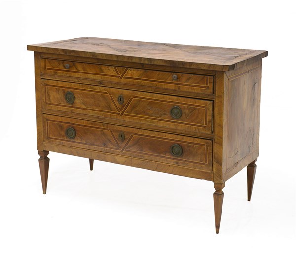 Cassettone lastronato e filettato a motivi geometrici in legni vari, fronte a due cassetti e mezzo, piedi troncopiramidali (cm 125x91x56) Secolo XVIII (mancanze)