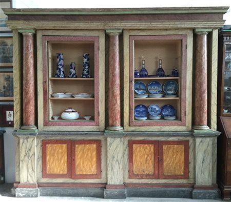 Antico mobile da farmacia a due corpi in legno laccato a finto marmo con parte superiore a due ante chiuse da reti metalliche tra colonne a tutto tondo, parte inferiore a quattro sportelli. (cm 297x264x50) (difetti e restauri)