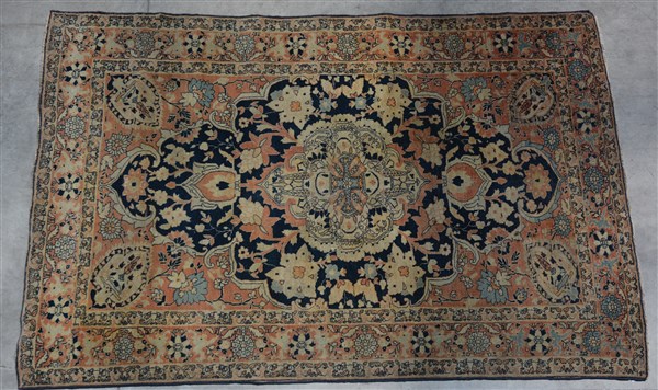 Tappeto Tabriz, Persia inizio secolo XX. Scuola di Hadji Djialili. Disegno a medaglione nei toni del rosa e beige su fondo blu (cm 166x120) (lievi difetti)