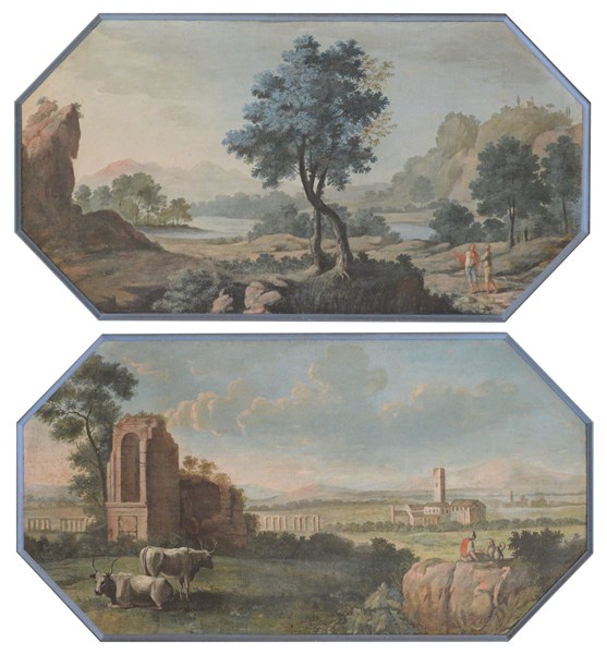 Scuola della fine del secolo XVIII "Paesaggi con figure, rovine e armenti" coppia di dipinti a tecnica mista su tele ottagonali (cm 82x160) (difetti)