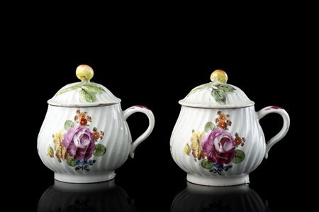 Manifattura di Vienna, secolo XVIII. Coppia di cremiere in porcellana, corpo a spirale, decorate in policromia a mazzi di fiori, presa in forma di frutto ed ansa mossa, marca di fabbrica alla base (difetti e restauri)