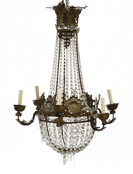 Lampadario a cesto a sei fiamme con portacandele e fregi in metallo sbalzato e dorato a volute e foglie, decorato a pendagli. Secolo XIX (cm 100) (difetti)