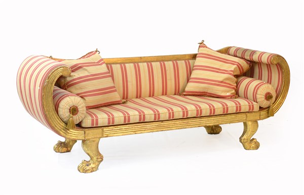 Dormeause in legno dorato , piedi a zampa ferina, secolo XIX (con quattro cuscini) (difetti)
