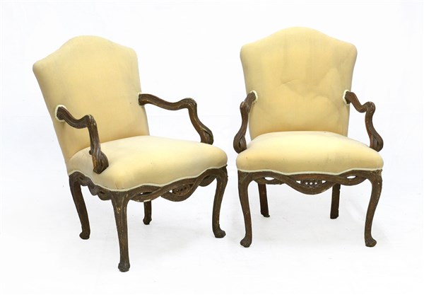 Coppia di poltrone con schienali sagomati, braccioli e fasce in legno laccato e intagliato a motivi geometrici, gambe mosse. Seconda metà del secolo XVIII (difetti e restauri)