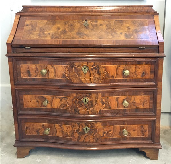 Ribalta di forma mossa lastronata, filettata e decorata sul fronte a cartelle radicate. Fronte a tre cassetti e anta ribaltabile celante scomparto e cassettini. Secolo XVIII (cm 110x108x47)(difetti e restauri)