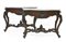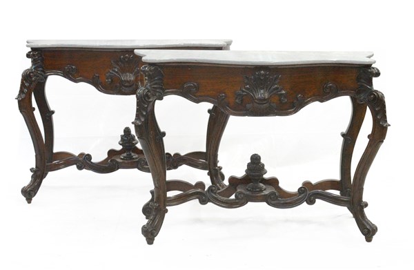 Coppia di consolles con fronte e fianchi mossi lastronati in noce, fasce sagomate e intagliate a fregi e volute fogliate. Gambe riunite da traverse centrate da vasi scolpiti a frutta. Piani in marmo grigio. Secolo XIX (cm 137x98x50) (lievi difetti)