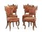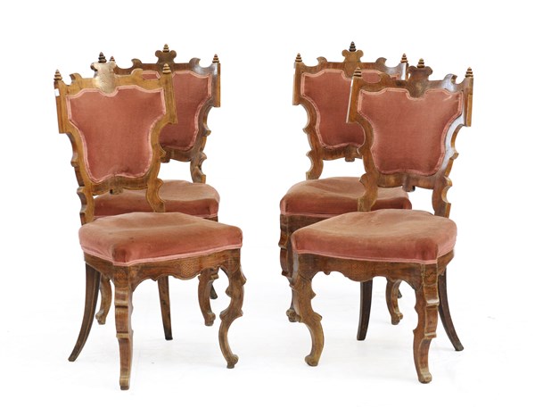 Gruppo di quattro sedie con schienali mossi filettati in legno chiaro a motivi geometrici, gambe anteriori sagomate e posteriori a sciabola. Secolo XIX (difetti)