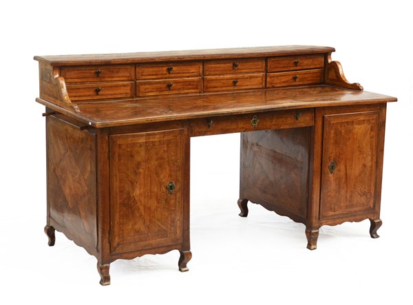 Scrivania da centro con alzata interamente lastronata in noce e radica di noce e filettata. Fronte ad un cassetto e due sportelli celanti cassettini. Alzata ad otto cassetti disposti su due file. Piedi sagomati, secolo XVIII (cm 173x100x82) (difetti e restauri)