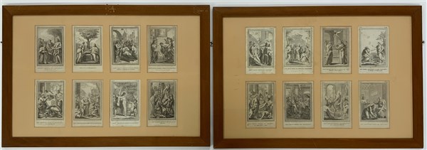 Gruppo di sedici antiche incisioni (cm 19x11) raffiguranti episodi della vita di Cristo in due cornici