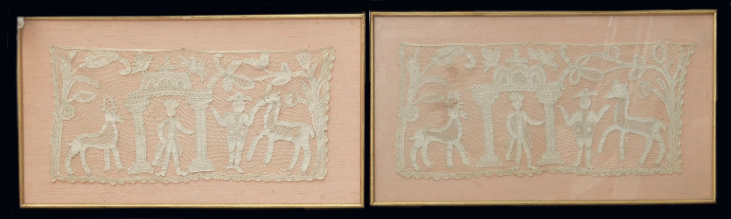 Due pizzi di forma rettangolare lavorati ad ago raffiguranti personaggi, animali e architettura. In cornice dorata. Francia (?), secolo XVII (misure del pizzo cm 54x25) (lievi difetti)