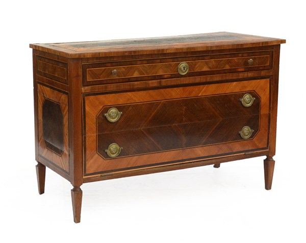 Cassettone ad un anta ed un cassetto sottopiano lastronati e filettati in legni vari. Secolo XVIII (145x96x63) (gravi difetti e restauri)