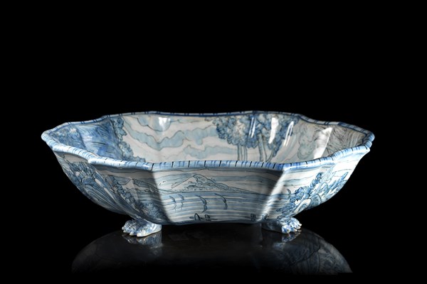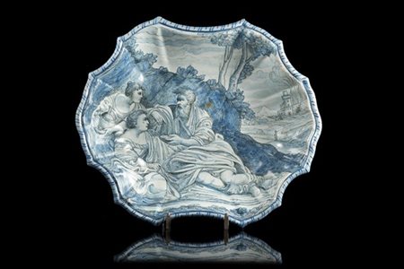 Manifattura ligure, secolo XIX. Bacile in maiolica con bordo sagomato decorato nei toni del blu con Lot e le sue figlie in un paesaggio. Piedi zoomorfi (cm 36x10x30) (lievi difetti)