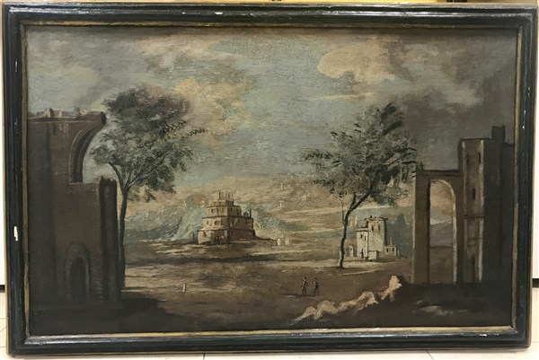 Ignoto, "Paesaggi" coppia di antichi dipinti ad olio su tela (cm 62x98,5) in cornici (difetti e restauri)
