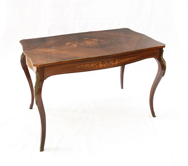 Tavolo da centro ad un cassetto con piano e fascia lastronati, filettati e intarsiati a mazzi di fiori, gambe sagomate, fregi e scarpette in metallo dorato (cm 113x72x64) (difetti e mancanze)