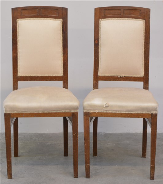 Coppia di sedie in legno con schienale rettangolare e gambe a sciabola, 1920 ci