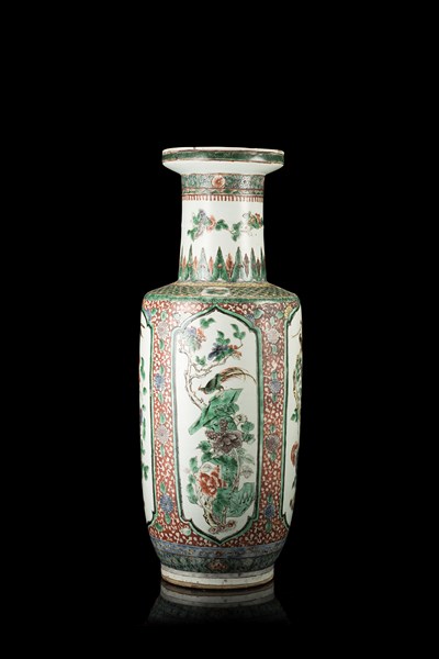 A large Famille Verte rouleau vase, decorated with floral motifs