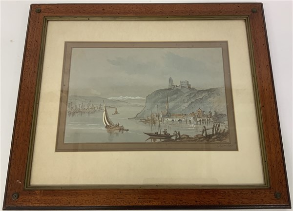 Caroline Jeanetta Capell "Paesaggio lacustre con scorcio di paese, figure e barc