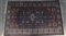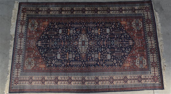 Tappeto Pakistan, secolo XX. Disegno con piccolo Gul bianco su fondo blu. Bordura a fondo bianco (cm 186x126) (difetti)
