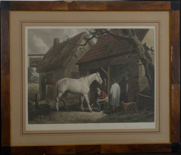 Acquatinta inglese raffigurante scuderia con cavallo (foglio cm 48x61 circa), in cornice (difetti)
