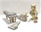 Manifatture diverse, lotto composto da due modellini di pianoforte, un vaso biansato ed una brocca con tappo, in ceramica decorata in policromia (h max cm 269 (difetti)