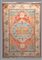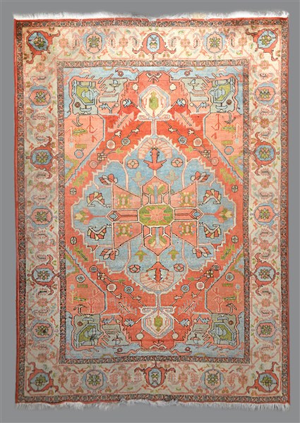 Decoro con motivo tipico dei tappeti Heritz. Medaglione lanceolato azzurro e rosa su fondo mattone. Bordura con motivo Herati su fondo bianco (cm 334x243) (difetti)