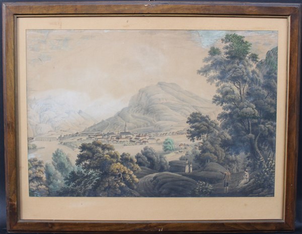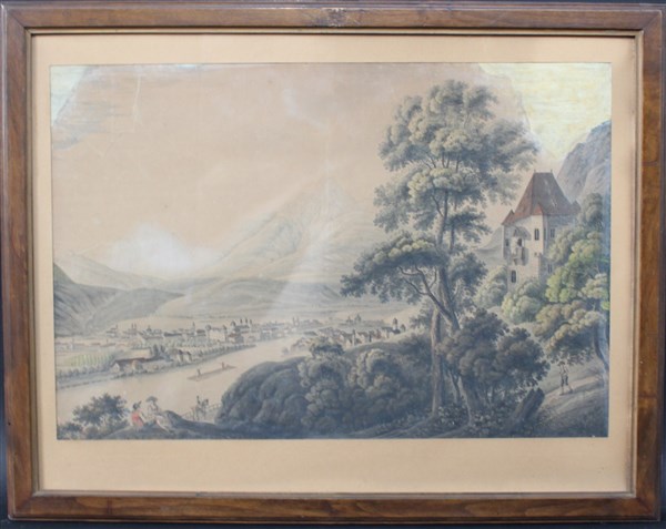 Gruppo di tre litografie colorate a mano raffiguranti paesaggi (cm 35x50) in cornici (difetti)