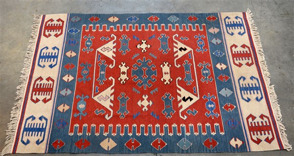 Tappeto Kilim, Yugoslavia, secolo XX. �Disegno geometrico nei toni dell'azzurro e bianco su fondo rosso (cm 218x153) (difetti)