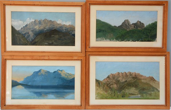Lotto composto da quattro dipinti ad olio di misure differenti raffiguranti "Corni di Canzo" "Lago subalpino" "Resegone soleggiato" e "Resegone con le nuvole" Opere attribuibili a Luigi Cattaneo (attivo nel XIX Secolo) In cornici (difetti e mancanze)