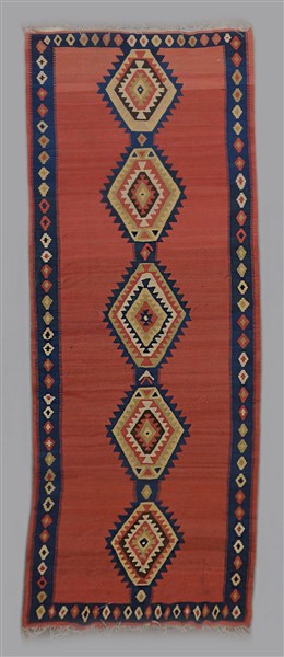 Tappeto Kilim, Anatolia, secolo XX. Decoro a medaglioni romboidali su fondo ros