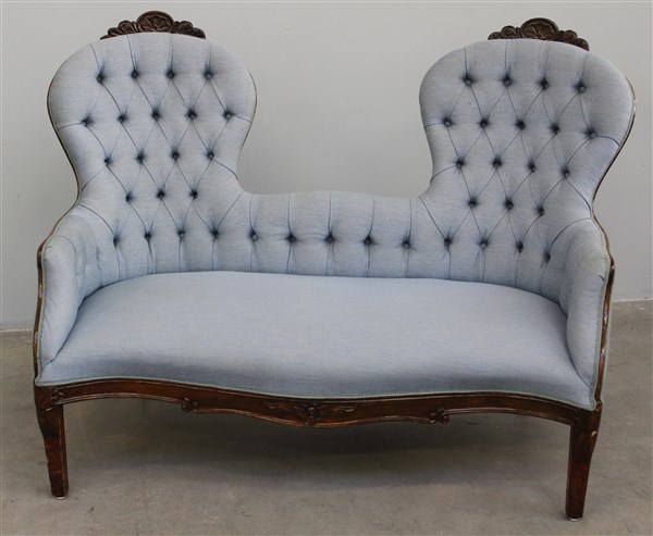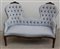 Divano con schienale sagomato intagliato a conchiglie rivestito in tessuto azzurro capitonnè, secolo XIX (difetti)