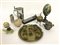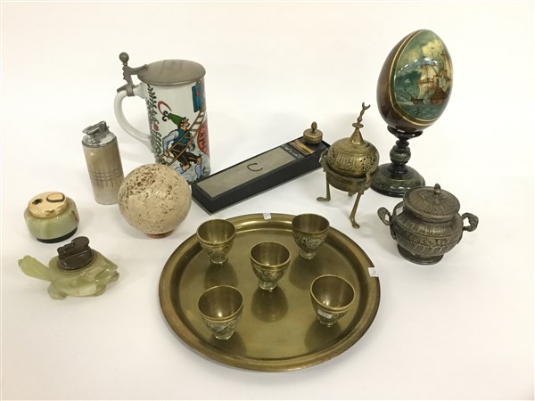 Lotto composto da tre accendini da tavolo, un boccale, una scultura raffigurante uovo, una sfera in pietra e alcuni oggetti in metallo (difetti)
