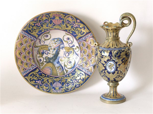 Manifattura di Gualdo Tadino, secolo XX. Lotto di un piatto ed un vaso in ceram