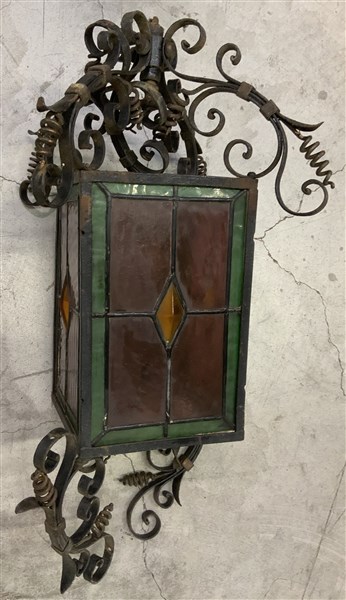 Lanterna in ferro battuto decorata a volute, spirali e vetri policromi. Sec. XIX/XX (h cm 65) (difetti e mancanze)