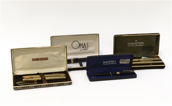 Lotto composto da cinque penne stilografiche ed una biro di diverse marche di cui due placcate oro, contenute in quattro custodie (difetti)