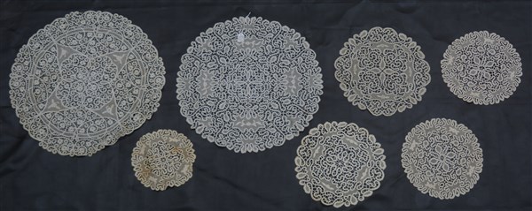Lavorato al tombolo con tecnica detta "di Cantù". Decorazione con numerose serpentine legate da una reticella. Misure diverse (il più grande d. cm 54) (lievi difetti)