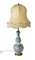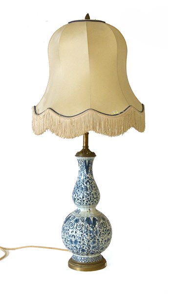 Vaso in maiolica decorato in blu a fiori e motivi vegetali (h cm 37). Montato in bronzo dorato e a luce elettrica in epoca posteriore, paralume in stoffa (difetti)