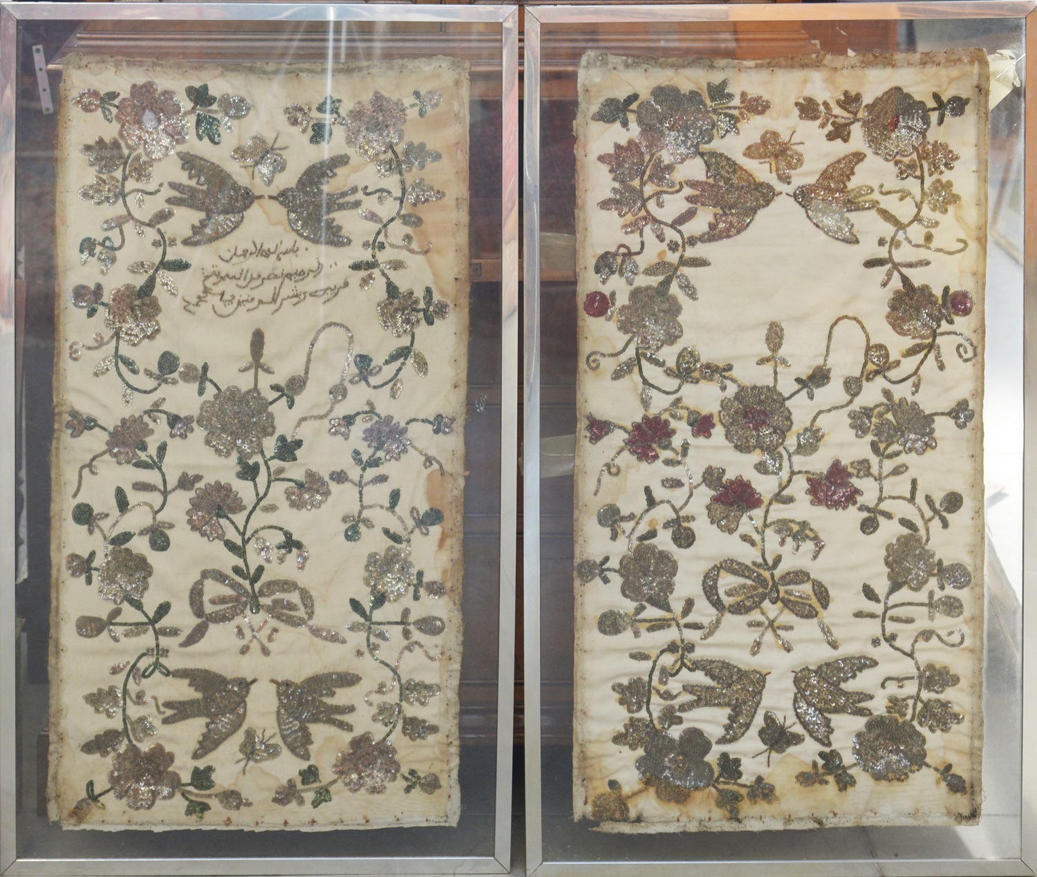 Due pannelli in seta ricamata con applicazioni di paillettes a formare volute e meandri fioriti con colombe e farfalle nei toni dell'argento, rosso e verde. Uno dei due reche scritte beneaugurali in arabo (cm 94x50) In cornici (cm 106x63)