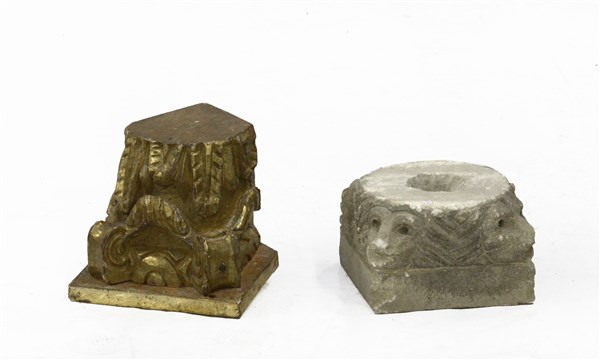 Lotto composto da un basamento di colonna in marmo scolpito con teste belluine e un capitello in legno intagliato e dorato (difetti)