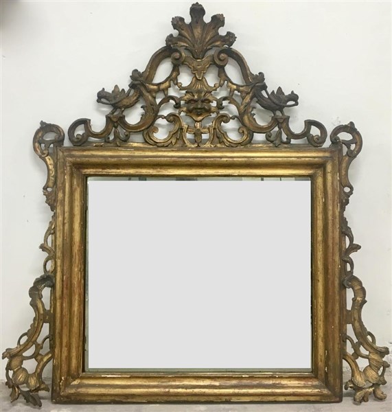 Specchiera in legno intagliato e dorato con cimasa scolpita a mascherone e volatili. Fregi laterali traforati. Secolo XVIII (cm 138x136) (difetti e restauri)