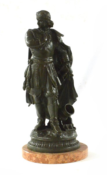 Ignoto "Figura con spada e cannone" scultura in bronzo (h cm 50) su base tonda in marmo rosso venato (difetti)