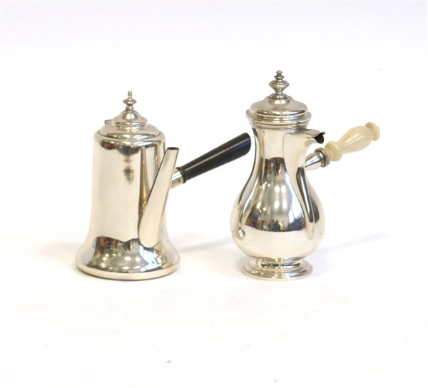 Lotto composto da una caffettiera con marchi inglesi del secolo XX e una con prese in avorio. Argentiere Miracoli, Milano (g lordi 600 ca.) (lievi difetti)