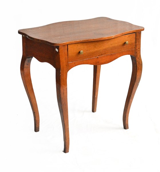 Tavolino ad un cassetto con piano sagomato e intarsiato a motivi fogliati e volute, gambe mosse (restauri) (cm 73x76x51)