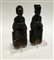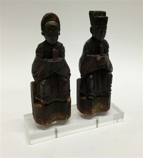 Arte orientale. Due sculture in legno dipinto raffiguranti coppia di antenati, base in plexiglass (h. cm 19) (difetti)
