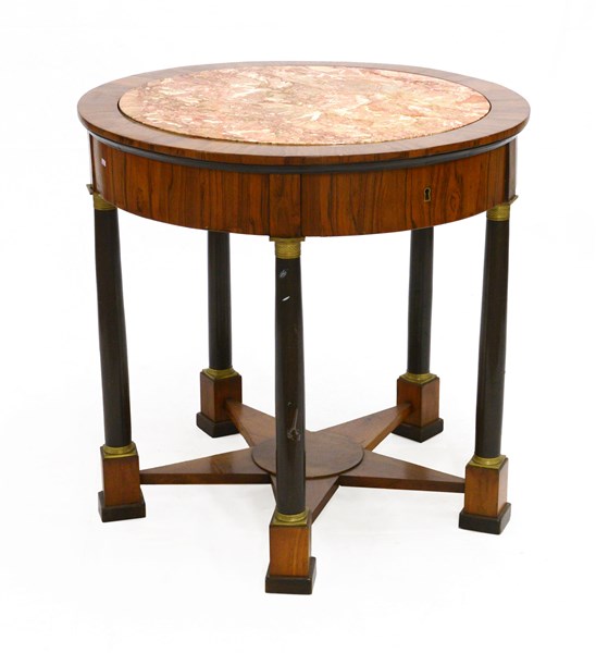 Tavolo tondo lastronato in noce con fascia ad un cassetto poggiante su cinque colonne tornite ed ebanizzate decorate da capitelli in bronzo e riunite a motivo a stella, piano in marmo (d. cm 82 x h. cm 72) (difetti)
