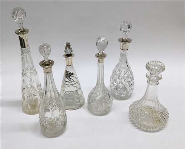 Lotto composto da sei bottiglie in cristallo di diversa fattura alcune con ghiere in argento (lievi difetti)