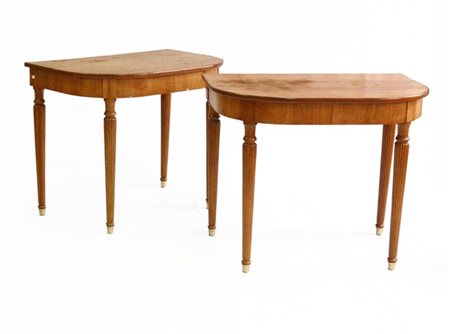 Coppia di consolles a mezzaluna con gambe a colonna scanalata, scarpette in met