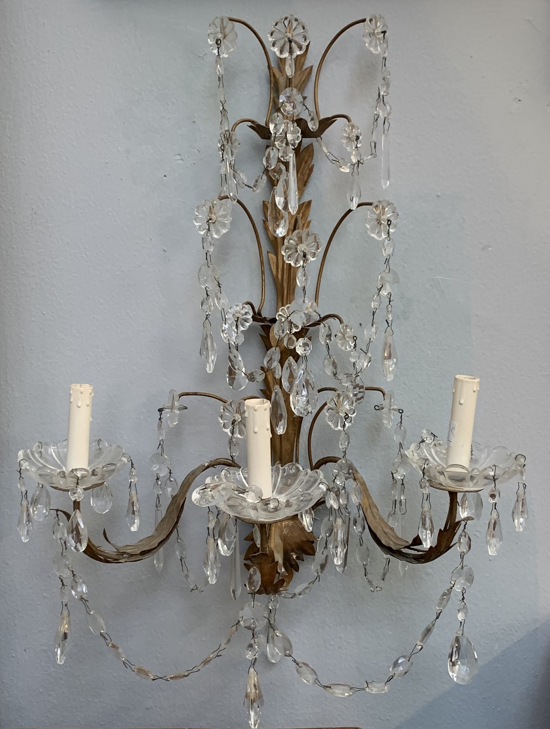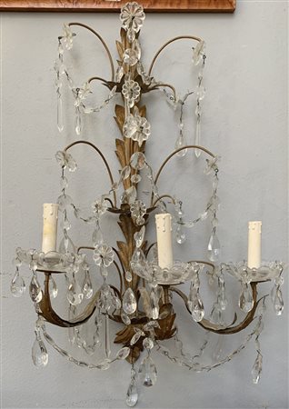 Coppia di appliques a tre luci in metallo dorato decorate a motivi fogliati con pendenti e bobeches in vetro (h. cm 63) (difetti)